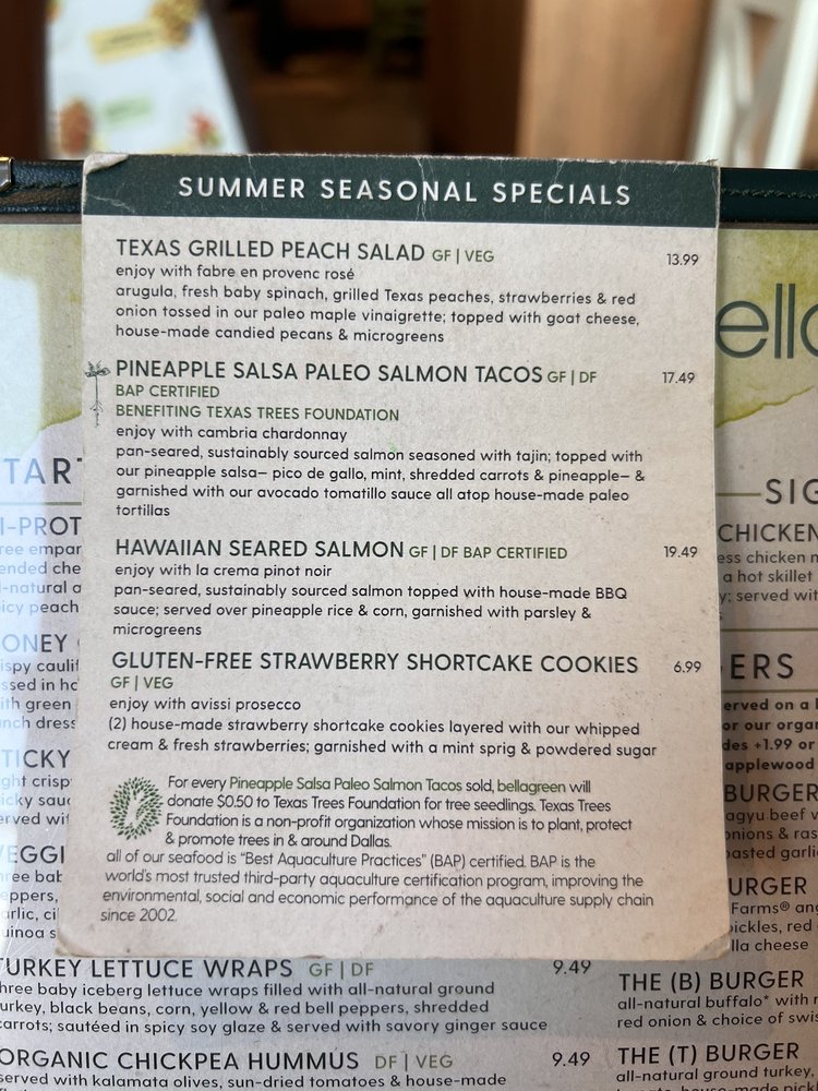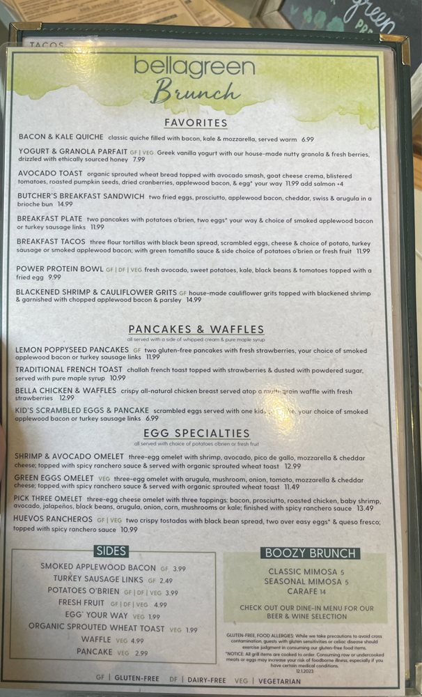 Introducing bellagreen - a trendy, casual, and classy restaurant in Plano, TX, offering a diverse menu of burgers, tacos, and salads. With a focus on sustainability, bellagreen provides compostable containers and reusable tableware. The breakfast and brunch options, like Greek Yogurt Pancakes and the Power Protein Bowl, showcase fresh, healthy ingredients. Customers rave about the quality and variety of dishes, from the Nature's Harvest Salad to the Pumpkin Pie Cheesecake. The attentive and knowledgeable staff, like Dominic and Donovan, ensure a comfortable dining experience for all. With options for vegan, gluten-free, and dairy-free eaters, bellagreen stands out as a must-visit spot for delicious and conscious dining.